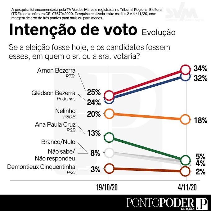 A segunda pesquisa Ibope para a Prefeitura de Juazeiro do Norte nas eleições 2020, divulgada nesta quarta-feira (4) pela TV Verdes Mares, aponta dois candidatos tecnicamente empatados. O atual prefeito, Arnon Bezerra (PTB), tem 34% das intenções de voto, e Glêdson Bezerra (Podemos) tem 32%.